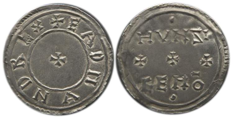 | Seaby 1105 Hunsige | Eadmund AR penny. AD 939-946. Unknown mint. Moneyer Hunsige. 22 mm, 1.22 g. EADMAND REX (sic) around small cross. / HVNSI ++++ GE MO in three lines, dot above and below. North 689; Seaby 1105; EMC 1002.0640. | Text | Image |