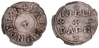 | Seaby 1105 Ingelgar | Eadmund, King of Wessex, AR Penny, 1.20 g, North Eastern, York mint, moneyer Ingelgar. AD 939-946. +EADMVND REX B around small cross pattée within circle, six dots in a triangular pattern after the E. / INGEL-GAR MO in two lines, three dots above and below, three crosses across the centre. North 688; Seaby 1105; BMC 84; SCBI 34.372; Carlyon-Britton I, 404. | Text | Image |