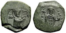 | SB 2013 | Alexius III angelus-Comnenus. 1195-1203 AD. AE Trachy. Constantinople. KE ROHQEI around, IC-XC to left and right of nimbate bust of Christ facing, right hand raised, holding scroll in left / ALEZIW DECP TW KOMNHNW, theta-WL to right, Alexius, crowned, and St Constantine, nimbate, each wearing divitision and loros, each holding a labarum and the two holding a patriarchal cross on globe between them. SB 2013, BMC 20ff. | Text | Image |