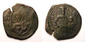 | SB 1965 DOC 3a | Andronicus I, Constantinople, Billon aspron trachy, 29mm. MHP-QV to left and right of Mary, nimbate, standing facing on dais, holding before her the nimbate head of infant Christ facing left / ANDRONIKOC DECPOTHC, IC XC (overscored) at upper right, full-length figure of emperor on left, wearing loros with two jewels between the waist and collar-piece, holding labarum-headed sceptre and cross on globe, crowned by Christ bearded and nimbate, holding book of gospels in left hand. Sear 1985; Dumbarton Oaks 3a. | Text | Image |