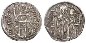 | SB 2587 | Anonymous AR Basilikons. Palaeologan, time of Andronicus II and Michael IX, 1294-1320. Constantinople mint. Struck 1304-1320. IC-XC across field, Christ, nimbate, seated facing on throne, holding gospels and raising hand; florets at sides of throne / MHP QV, Mary, nimbate, enthroned facing, holding the nimbate infant Christ; B-B across fields. DOC V 544; Sear 2587. | Text | Image |