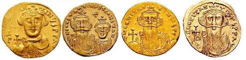 | SB 974 | Constans II, AV Solidus Constantinople mint. VICTORIA AVGU and officina letter, facing bust of Constans, with long beard and moustache, wearing plumed helmet not ornamented with cross, holding cross on globe / no legend, Constantine IV, in center, Heraclius on right and Tiberius on left, all standing facing, each wearing crown and chlamys and holding cross on globe; mintmark CONOB. Sear 974. | Text | Image |