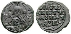 | SB 1818 | Constantine VIII, Class A3 anonymous follis, 9-10g. 1025-1028 AD. IC-XC to right and left of bust of Christ facing with nimbus cross behind head, 2 dots in each limb of the cross, holding book of gospels with dot in centre of the book's border / +IhSUS XRISTUS bASILEU bASILE in four lines. SB 1818. | Text | Image |