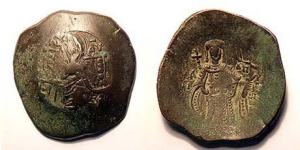 | SB 2004 | Isaac II Angelus. 1185-1195 AD. AE Tetarteron. Constantinople mint. MP-theta V to left and right of Mary, nimbate, standing facing on dais, both hands raised (orans), the nimbate head of the infant Christ facing before her / IC AA K I on left, DEC P O T HC on right, Isaac standing facing wearing crown, divitision and chlamys, and holding cross-tipped sceptre and akakia; hand of God at upper right. SB 2004; BMC 38-42. | Text | Image |