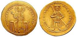 | SB 1844 | Isaac I Comnenus. 1057 - 1059. AV histamenon nomisma (Scyphate). 4.38 gm. Constantinople. AV Histamenon Nomisma 4.41 gm. +IhS XIS REX REGNANTInM, Christ seated facing on bench throne, holding Gospels / +ICAAKIOC RA-CILEVC RWM, Isaac standing facing, crowned and in military uniform, holding labarum in right hand and resting with left hand on sword in sheath. DO. 1; S 1844. | Text | Image |