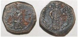 SB 1955 | John II, 1118-1143 AD, AE Half Tetarteron. Thessalonica. Q DI MI-T PI O C to left and right of St. Demetrius, nimbate, facing, in military dress, no beard, standing, holding sword and shield / IW DEC, Crowned bust of John facing, wearing jewelled chlamys, holding labarum and cross on globe. SB 1955. | Text | Image |