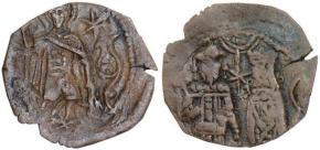 | SB 2521 | John V and Anna of Savoy. 1351-1354 AD. AE Assarion, 0.77g. Thessalonica. Anna standing, holding model of city and sceptre / John standing, holding labarum-headed sceptre and akakia. Sear 2521; Grierson 1507; Bendall 5. | Text | Image |
