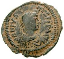 | MIB 34 | Justin I, AE nummus. AD 518-527. DN IVSTINVS PP A, pearl-diademed, draped and cuirassed bust right. / oNvT monogram of Justin in wreath. Hahn MIB 34. BMC Vandals (as Anastasius) 135-138. | Text | Image |