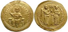 | SB 1826 | Michael V Kalaphates, AV histamenon nomisma (4.44 gm). Thessalonica. +IhS XIS REX REgNANTIhM, Christ enthroned facing, nimbus cross behind head, holding book of gospels and raising right hand / +MI-XAHL DESPOT, the archangel Michael, winged, on left in tunic and mantle, and Michael V, with short beard, wearing saccos and loros, standing facing, holding labarum between them; manus Dei (the hand of God) crowning him. SB 1826. | Text | Image |