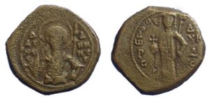 | SB 2168 | Theodore Comnenus-Ducas, empire of Thessalonica. AE Trachy. 1224-1230 AD. IC-XC EMMANOVHA to left and right of bust of Christ, holding scroll, star to left and right / QEODOPOC DECPOTHC KOMNHNOC O DOVKAC, Theodore, standing, wearing loros, holding labarum-headed sceptre and single or double-barred cross on globe, hand of god above. DOC 10; SB 2168. | Text | Image |