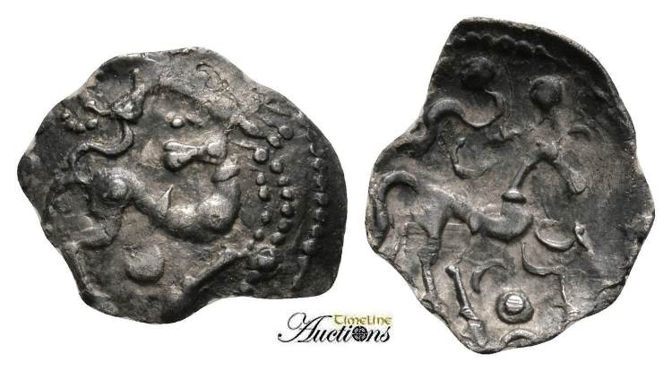 | Hobbs 2443 | Celtic, The Trinovantes. Dubnovellaunos. ca 1st Century BC. AE 15mm. Stylized head left, star before / Horse jumping right; quadral below, dot and dot in ring before. | Text | Image |