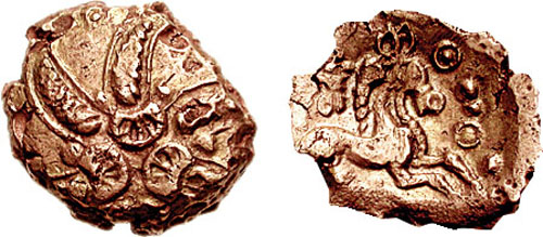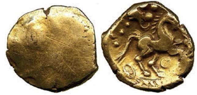 | VA 1476 | Celtic Britain, Trinovantes AV Stater. ca 55-45 BC. Early Uninscribed L Gold, Whaddon Chase type. Celticized head of Apollo right / Celticized horse running right, wheel before, winged object and dot-triangle above, dot-in-ring below. Hobbs 306-328. | Text | Image |
