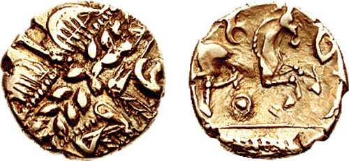 | VA 1478cf | Celtic, Trinovantes AV Quarter Stater. Whaddon Chase Type. Devolved head of Apollo right; two wings above the laurel wreath / Horse galloping right; winged annulet above, dot-in-annulet below. | Text | Image |
