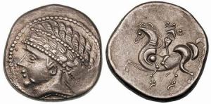 | Gobl 11b | Celtic, Noricum, Austria. Late 2nd-1st century BC. AR Tetradrachm. 8.98 g, Tinco. Wuschelkopf type. Diademed head of Apollo right, the diadem forming a solid column of pellets dividing hair and face, ΛΛ below / Horse galloping left, eight-spoked wheel above, TI below. Göbl, Noricum 11/b (O85b/R175); cf. CCCBM I 172; KMW 916; De la Tour 9915; cf. Allen & Nash 57. | Text | Image | |