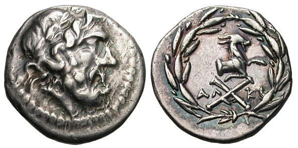 | BCD 399 | Achaean League, Aigeira, AR Hemidrachm. Laureate head of Zeus right / Forepart of goat right over monograms, Achaean League AX monogram with AL to left, KI to right; all within laurel wreath, tied below. BCD 399; Agrinion 571a; Clerk 16; Benner-Aigeira 5. | Text | Image |
