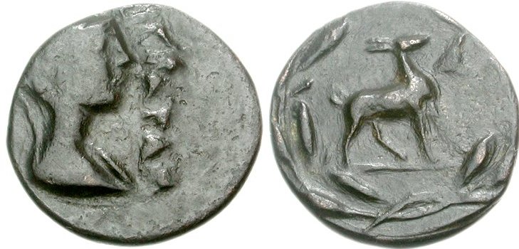 | BCD 410 | Aigiera, Achaia, AE18. ca. 40-30 BC. AIΓIΡATAN to right of veiled and draped female bust right / Stag standing right, ΛA or AV in right field, all within wreath. BCD Peloponnesos 410. | Text | Image |