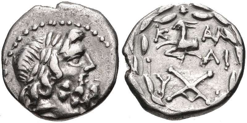 | BCD 386 | Aigeira, Achaia. Late 5th-early 4th century BC. AR Hemidrachm. 14mm, 2.58 g. Wreathed and bearded head of Dionysos right / Forepart of goat left. BCD Peloponnesos 386; SNG Copenhagen 125. | Text | Image |