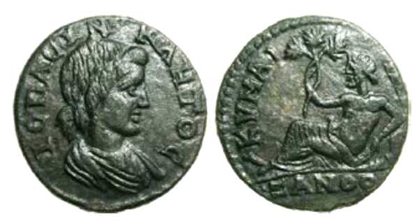 | Leu 4, 433 | Julia Domna, AE28 of Kyme, Aeolis. AD 193-217. 13.24 g. IOY ΔOMNA CEBACTH, draped bust right. / KYMAIΩN, Amazon walking left, holding short spear in her right hand and with serpent coiled around her left arm, small figure of a subdued Atlantian at foot left. Apparently unpublished. Leu 4, 433. | Text | Image | |