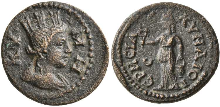 | BMC 118 | Kyme, Aeolis. AE16, 3.09 gr. semi-autonomous issue, AD 253-268. KYMH, Turreted and draped bust of the Amazon of Kyme ("Tyche") right / KYMAIΩN, Tyche standing left, kalathos on head, holding rudder and cornucopiae. BMC 118; SNG von Aulock 1650; Luynes 2527. | Text | Image | |