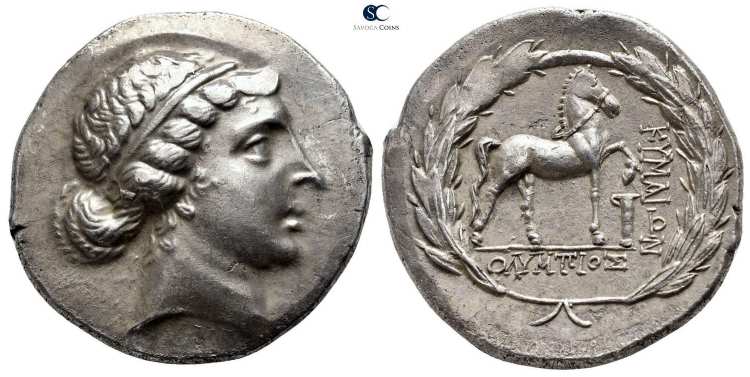 | Oakley 50-53 | Aeolis, Kyme. After 165 BC. AR Tetradrachm AR 30 mm., 16,56 g. Magistrate Olympios. Head of the Amazon Kyme right, wearing taenia. / KYMAIΩN, horse right, one-handled cup below, OΛYMΠIOΣ in exergue. Oakley 50-53; BMC 80-81; Boston MFA 1651; Luynes 2524; Pozzi 2302. | Text | Image | |