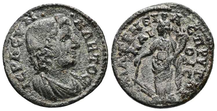 | Paris 215 | Faustina II, AE25 of Kyme, Aeolis. AD 146-180. 7 g. ΦAYCTEINA CEBACTH, draped bust right. / EΠI CTΡ AL..NTOC KYMAI.., Isis Pharia standing right on galley, holding the sail in both hands. Paris 215; SNRIS Supp. Cyme 6.3; Peus 398, 672; RPC IV.2 temp 2604. | Text | Image | |