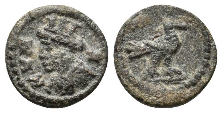 | SNG vA 7702 | Kyme, Aeolis, AE14, semi-autonomous issue, AD 240-268. 1.72 g. KYMH, turreted head of Tyche left. / No legend, eagle standing right, wings closed. SNG von Aulock 7702; SNG Cop 138. | Text | Image | |