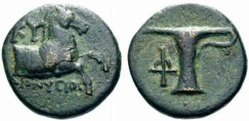 | BMC 42 | Kyme, Aeolis. AE17. 320-250 BC. Magistrate Dionysios. KY to left, ΔIONYCIOC beneath forepart of horse right. / IΩT monogram to left of a one-handled cup. BMC 42; Weber 5490; SNG Munich 463. | Text | Image | |