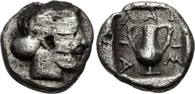 | AMC 12882 | Larissa Phrikonis, Aeolis. AR obol, 350-300 BC. 7.5 mm, 0.49 g. Head of nymph right, hair in a sphendone. / ΛAΡIΣAI around amphora in square incuse. AMC 12882; Traite II-2, 2064 var (denomination). | Text | Image |