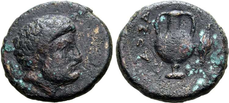 | wwxls 10782 | Larissa Phrikonis. AE 8 mm, 400-300 BC. 1.05 g. Amphora. / ΛAΡ monogram in circle of dots. wwxls 10782; Nomos 25, 291. | Text | Image |