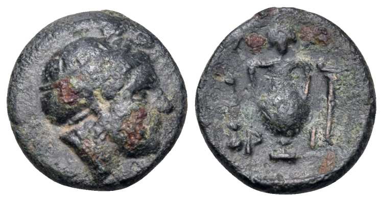 | BMC 3 | Larissa Phrikonis, Aeolis. 4th century BC. AE 10mm, 1.24 g. Female head left, hair bound in sphendone / ΛAΡI, Amphora; caduceus to left, grape bunch to right. BMC 3; Traite 2069. | Text | Image |