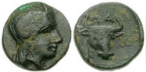 | SNG vA 1658 | Larissa Phrikonis, Aeolis. AE 11 mm, 400-300 BC. 1.3 g. Head of nymph left, hair in a sphendone. / ΛAΡIΣA, bull standing right. SNG von Aulock 1658. | Text | Image |