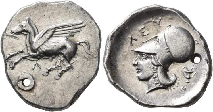| Pegasi 139 | Leukas, Akarnania. Circa 405-345 BC. AR Stater. Pegasos flying left; L / Helmeted head of Athena left; X below, Λ and stylis behind. | Text | Image |
