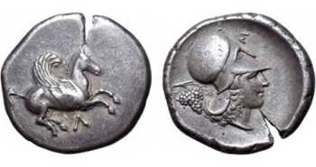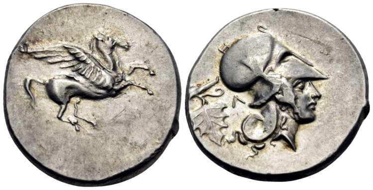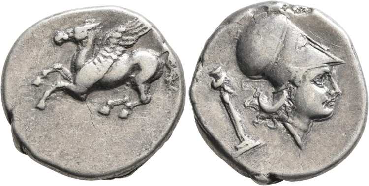 | BMC Corinth 39 | Leukas, Akarnania, AR Stater. 20 mm 8.73 g. ca 350-320 BC. Pegasos flying left, Λ below. / ΛEY above helmeted head of Athena left, horizontal palmette behind head. BMC (Corinth volume) 39; Pegasi 61; SNG Cop 341; BCD 198; Mionnet Supp. III, 55; Traité II-4, 120. | Text | Image |
