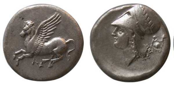 | Pegasi 35 | Leukas, Akarnania. AR Stater. 425-400 BC, 8.34 g. Pegasos flying left with curled wing, ΛEY below. / Helmeted head of Athena left, bow behind head, within shallow incuse. BMC 16; Pegasi 35; BCD Akarnania 188; SNG Cop 331; Traité II-4, 77. | Text | ![]() |