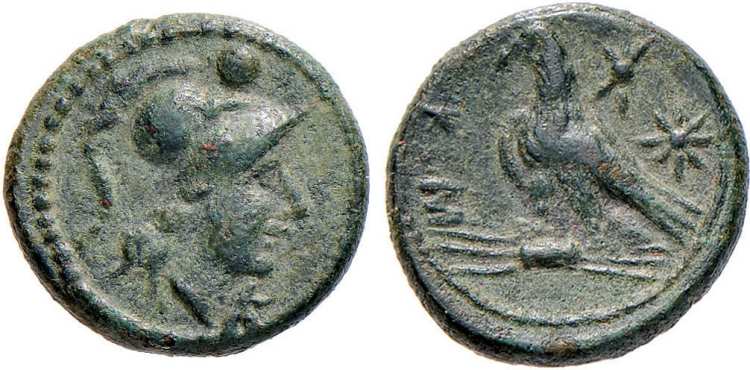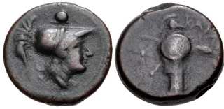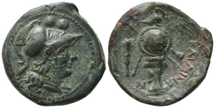 | HN Italy 764 | Caelia, Apulia, AE22 sextans, ca. 210-150 BC. 6.96 g. Helmeted head of Athena right, two dots above. / KAIΛINΩN, trophy, upright club to left. HN Italy 764; SNG ANS 670-671; SNG Cop. 632. | Text | Image |