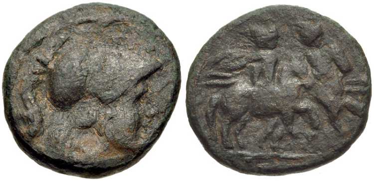 | HN Italy 770 | Caelia, Apulia, AE12 Semunicia, ca. 210-150 BC. 1.67 g. Helmeted head of Athena right. / KAIΛINΩN beneath the Dioskuri on horseback right. HN Italy 770; SNG ANS 680-685; Righetti Collection, 10411. | Text | Image |