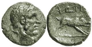 | Imhoof MG 262 | Psophis, Arkadia, AE17 dichalkon, 3.6 g. 250-200 BC. Laureate head of Herakles right / ΨQFI, the Erymanthian boar running right. Imhoof MG 262; BCD Peloponnesos 1686. | Text | Image |