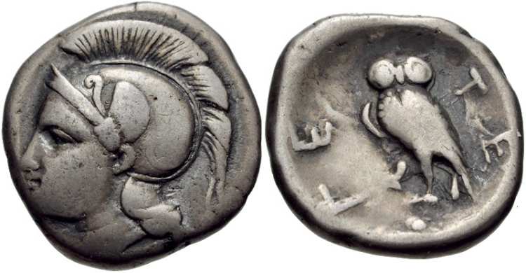 | BCD Pelop. 1725 | Tegea, Arkadia. AR Hemidrachm ca 370-350 BC. 14 mm, 2.61 g. Helmeted head of Athena left. / TE-ΓE, owl standing left, on olive branch, head facing. BCD Peloponnesos 1725. | Text | Image |