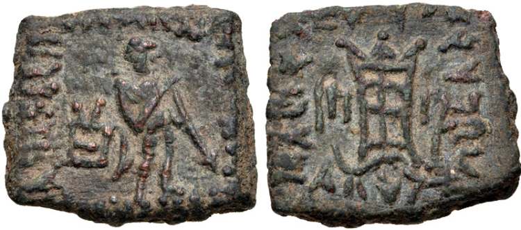| Chakwal Hoard 117 | Baktria, Indo-Greek Kingdom. Strato II Soter. AE 21x19mm, 7.74 g. Apollo standing right, with quiver on back, holding arrow; monogram to left. / Tripod; pi in Kharosthi to left; am in Kharosthi to right. Hoover HGC 479; Senior, Chakwal Hoard, 117. | Text | Image |