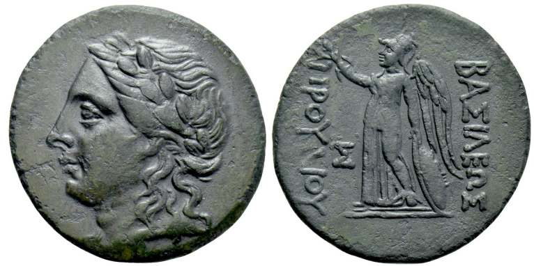 | RecGen 16 type 9 | Kingdom of Bithynia, Prusias I Chlorus AE 27mm. Laureate head of Apollo left / BAΣIΛEΩΣ ΠΡOYΣIOY, Athena-Nike standing left, winged and wearing a Corinthian helmet, crowning the king's name with a wreath, and resting hand on shield decorated with a Gorgoneion to right, HΓ monogram at inner left. SNGCop 625. | Text | Image |
