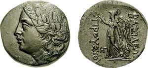 | RecGen 21 | Prusias I, King of Bithynia. AE38. 230-187 BC. 41.56 g. Head of Hermes right, wearing petasos, countermark of caduceus behind head. / BAΣIΛEΩΣ ΠΡOYΣIOY, lyre with five strings and elaborate resonator. ΡΨ, MH monogram and TΡΣ monogram below. RecGen 21; SNG Ashmolean 447-448; Hoover HGC 628. | Text | Image |