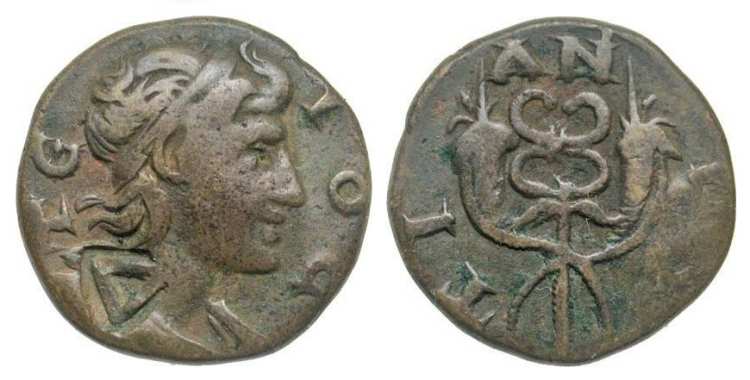| SNGvA 1045 | Gallienus, AE of Tium, Bithynia. 7.15 g. Π Λ ΓAΛΛHNOC CEB, laureate, draped, cuirassed bust right / TIANΩN, Serapis standing front, head left, holding sceptre and raising right hand. SNG von Aulock 1045. | Text | Image |