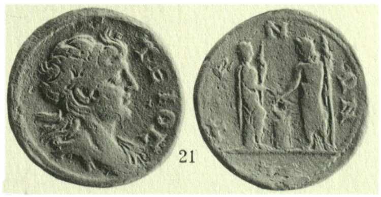 | CNG 88, 862 | Marcus Aurelius, AE33 of Tium, Bithynia. AD 161-180. 25.02 g. AYT KAIC M AYΡH ANTΩNEINOC, laureate bust right, slight drapery on left shoulder / TEIOC ΔIONYCOC, Tyche standing right, holding parazonium, standing right, clasping hand of Dionysus, loins draped, standing left, holding thyrsos. Apparently unpublished. | Text | Image |