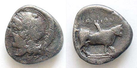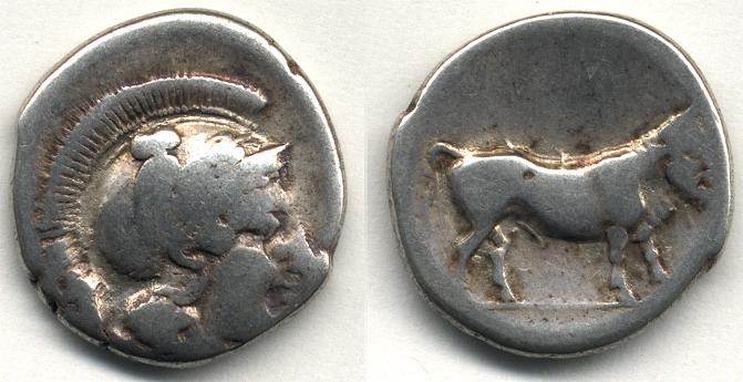 | SNGANS 261 | Hyria, Calabria AR Didrachm. ca 405-385 BC HN-539, SNG ANS-261. Head of Athena left / Man-headed bull standing right. HN 539.