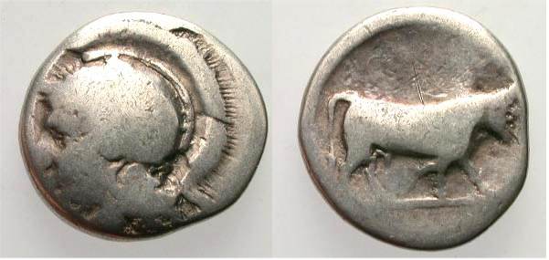 | SNG ANS 251cf | Hyria, Calabria, 405-400 B.C. AR Didrachm. 7.35 grams. Head of Hera, three-quarter face to riight, in broad stephanos, richly ornamented, and necklace. / Man-faced bull walking right. | Text | Image |