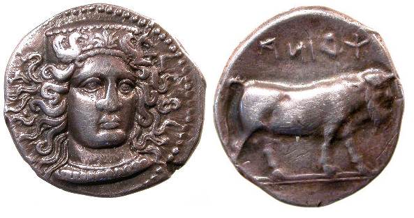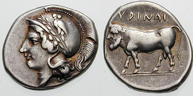 | SNGCop 380 | Hyria, Calabria AR Didrachm or Nomos. 405-400 BC. Head of Hera, three-quarter face to right, in broad stephanos, richly ornamented, and necklace / man-faced bull walking right, retrograde legend ΨPINA above.
