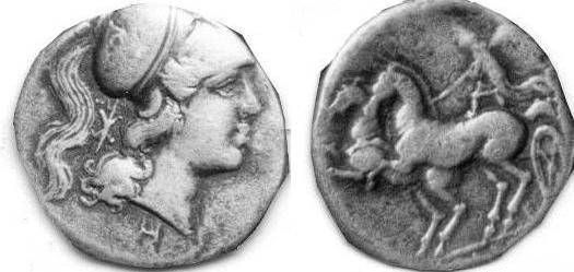 | Prowe 35 | Cales, Campania, AR didrachm, 334-268 BC, 21 mm 7 g. Head of Athena right, in Corinthian helmet decorated with a palmette, flower behind head. / CALENO, Nike in biga galloping left. Prowe (1904), 35. Var of Sambon 901; Paris 163; SNG France I 421 (laurel branch behind head). | Text | Image |