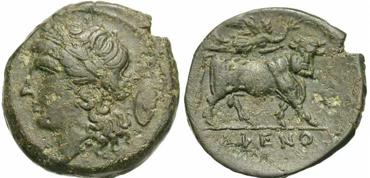 | SNG Cop 313 | Cales, Campania AE21. After 268 BC. CALENO, head of Apollo left, fly behind / man-headed bull right, lyre above, Q between legs, CALENO in ex.