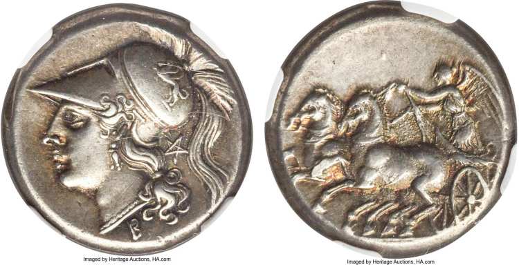 | SNG ANS 170 | CAMPANIA, Cales. ca 265-240 BC. AR Didrachm. Head of Athena left, in crested Corinthian helmet decorated with a dolphin; cornucopiae behind head / CALENO, Nike in biga galloping left, holding reins in both hands. Sambon 886; BMC 1; Hunter 1; SNG ANS 170; SNG Cop 304; Paris 158; SNG France I 432 corr. (symbol positions reversed in error).