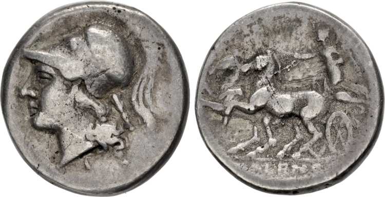 | CNG 71, 2 | Cales, Campania. Circa 265-240 BC. AR Didrachm. Helmeted head of Athena right, in undecorated Corinthian helmet, no symbol. / CALENO, Nike, holding whip and reins, driving biga left. Unpushlished with head right without symbols. CNG 71, 2.